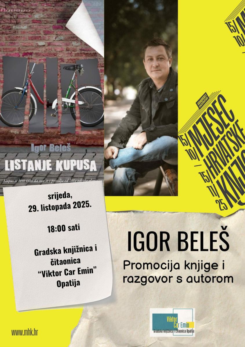 Čak četvrto izdanje romana „Listanje kupusa” najbolja je referenca za književnu večer i susret s mladim autorom Igorom Belešom koji će se održati 29.10. u 18:00 sati. Ovjenčan nagradom „Fran Galović”, ovaj roman nazivaju i romanom koji će obilježiti generaciju, asocira na serijal „Pet prijatelja” ali „za odrasle i za one koji zbog rata nisu nikada uspjeli odrasti ili su, pak, to uspjeli, ali okrnjeno, ukrivo, a da za to nisu krivi”. U tijeku je pretprodukcija za snimanje dugometražnog igranog filma. Pozivamo sve zainteresirane da nam se pridruže na ovoj književnoj večeri u kojoj ćemo razgovarati o romanu koji će sasvim sigurno naći svoje mjesto na popisu obaveznog štiva novih generacija čitatelja.