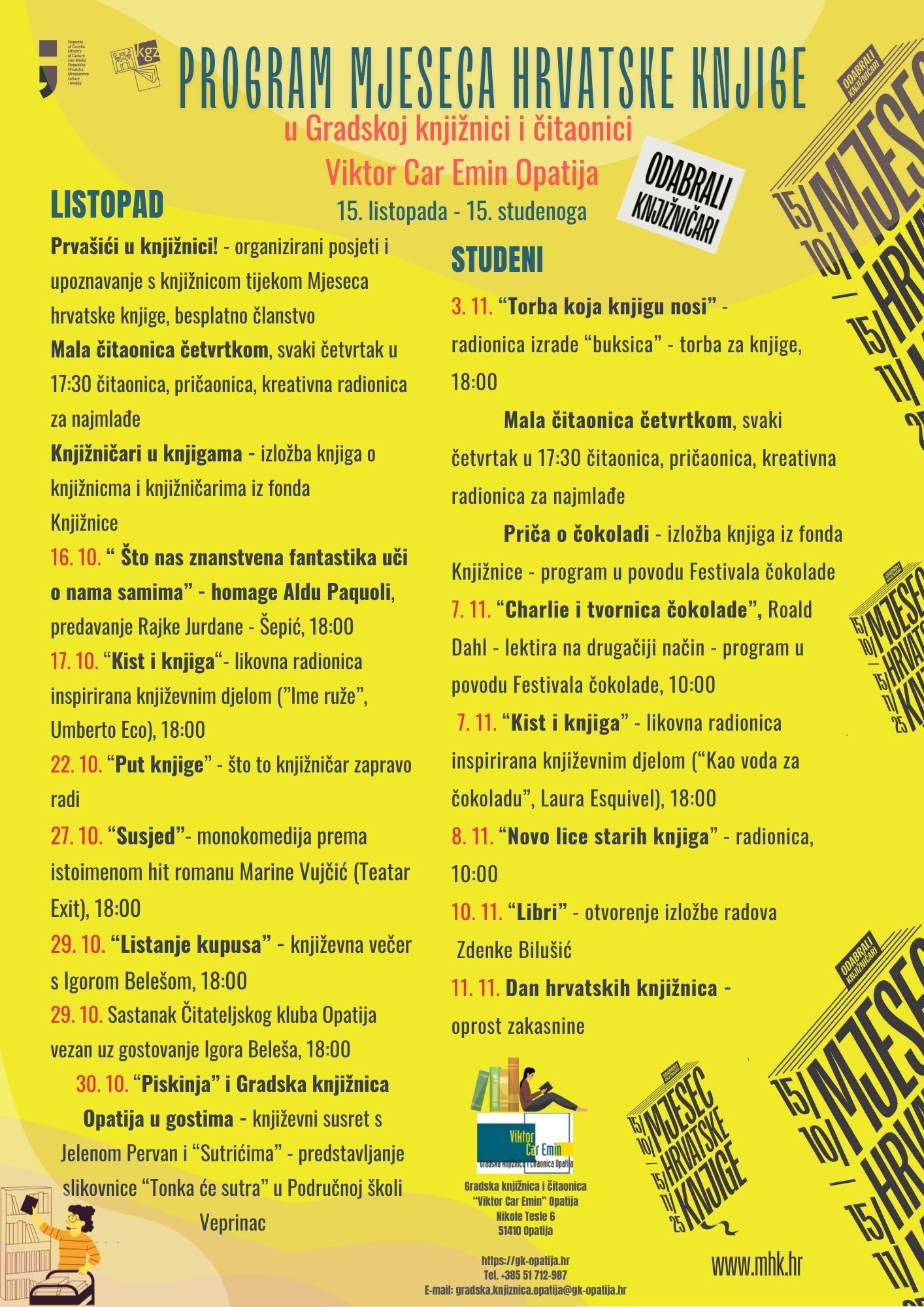 Stoga vas pozivamo da u raznovrsnom programu Gradske knjižnice i čitaonice “Viktor Car Emin” Opatija područnih Knjižnica Kastav, Lovran, Matulji i Mošćenička Draga provjerite što smo vam pripremili jer Mjesec hrvatske knjige nikada nije bio maštovitiji, ali to vam je tako kada – odaberu knjižničari. :)