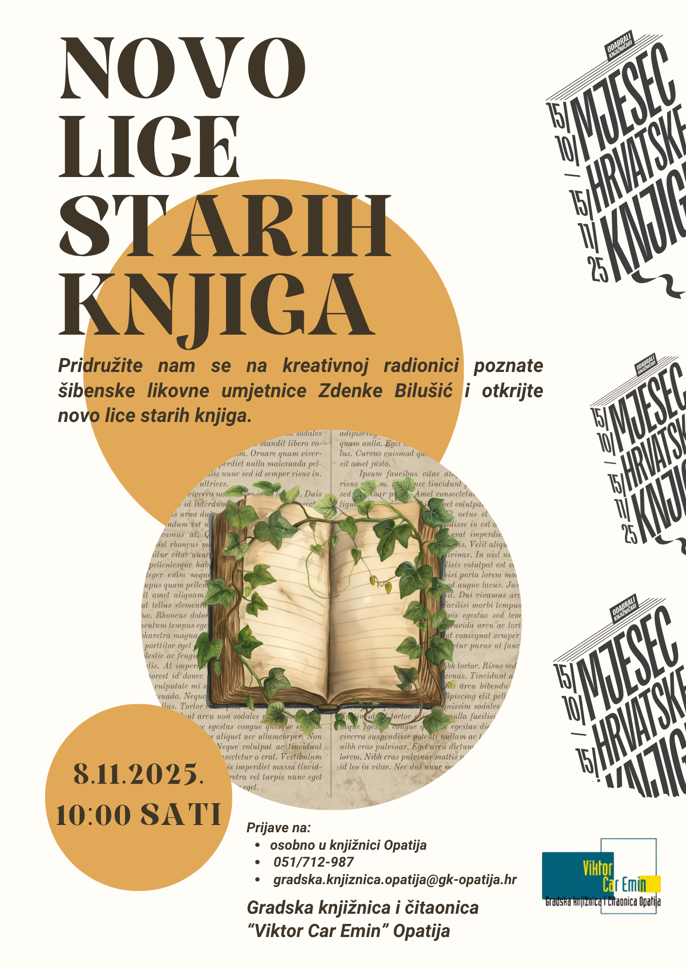 Novosti/Najave Novo lice starih knjiga - 8.11. u 10h 8. studenog od 10:00 sati oblikovat će se „Novo lice starih knjiga” na kreativnoj radionici poznate šibenske likovne umjetnice Zdenke Bilušić.